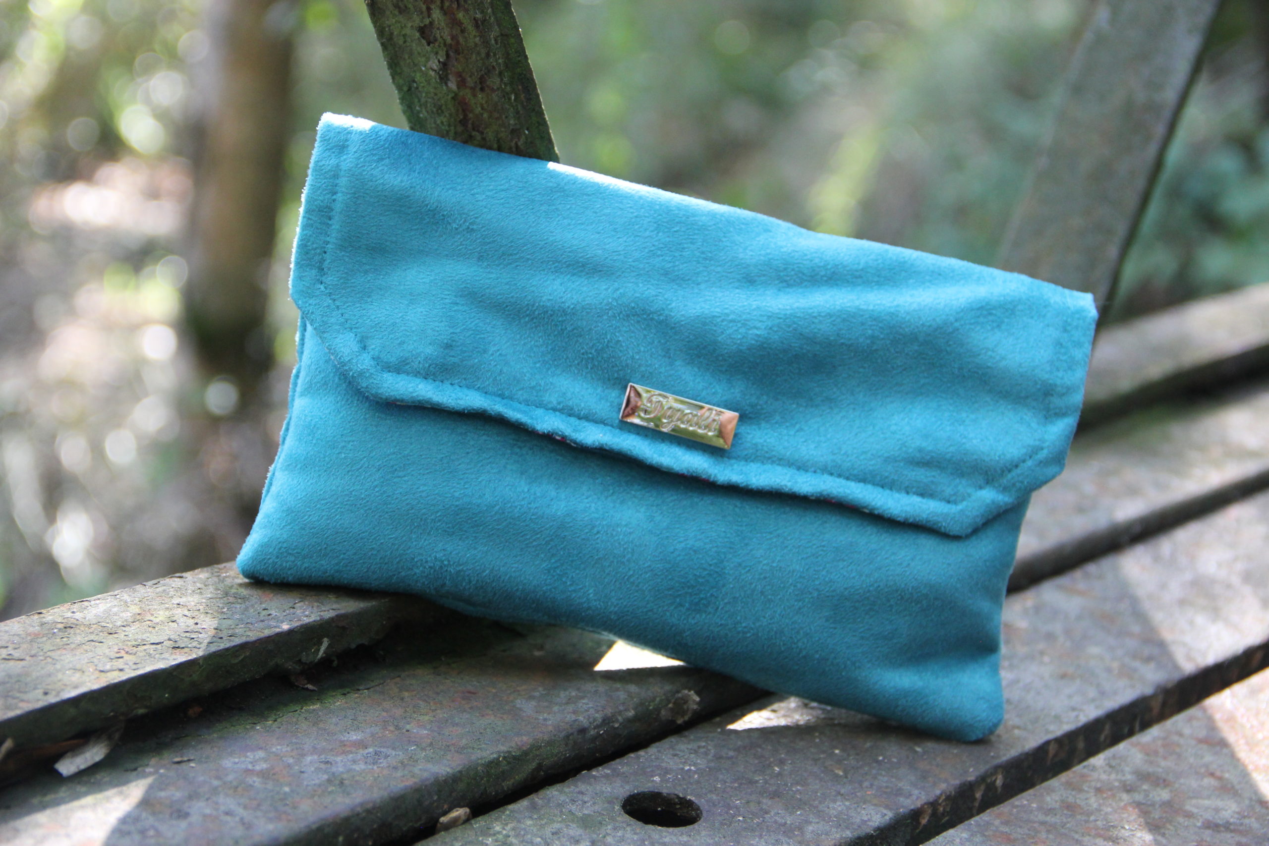 Trousse pour sac réalisée avec une suédine bleu et doublé d’un coton bleu avec des motifs style baroque.